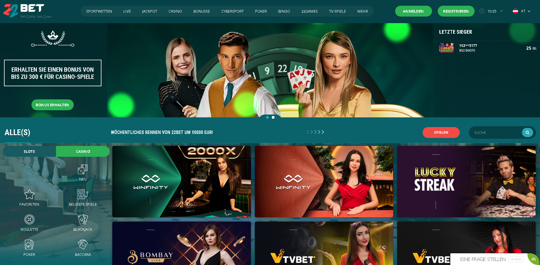 Vor allem der Live Casino Bereich ist hier hervorzuheben und übertrifft alles bisher Dagewesene. Meine persönlichen 22bet Erfahrungen? Eines der besten Online Casinos am Markt!