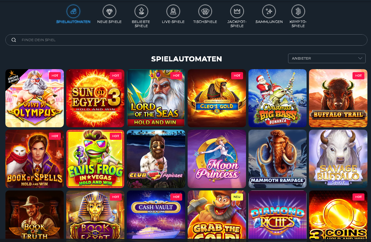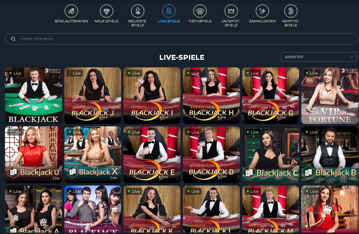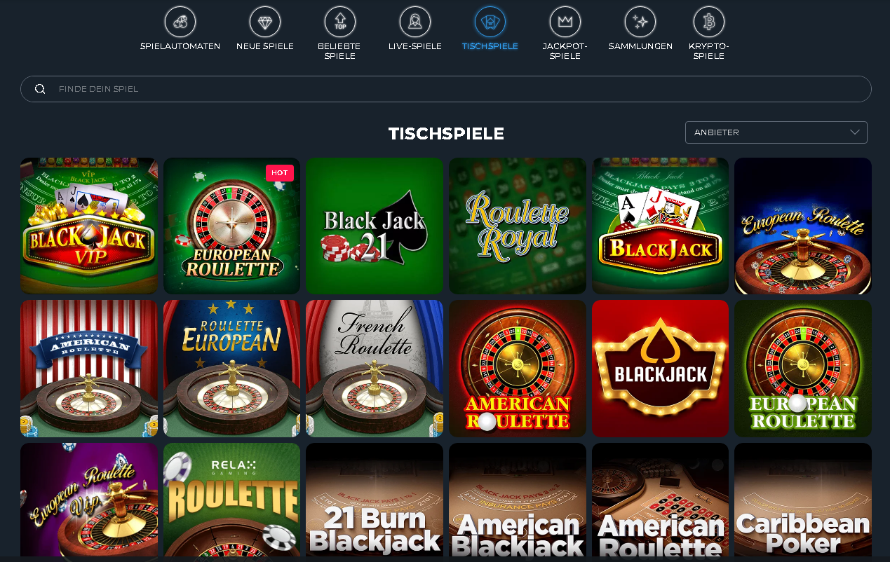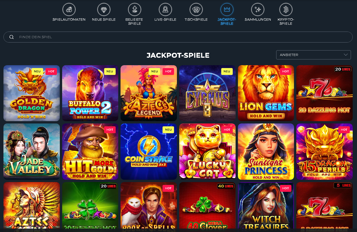 Spielautomaten, Jackpots, Kartenspiele, Roulette und Live-Casino-Spiele